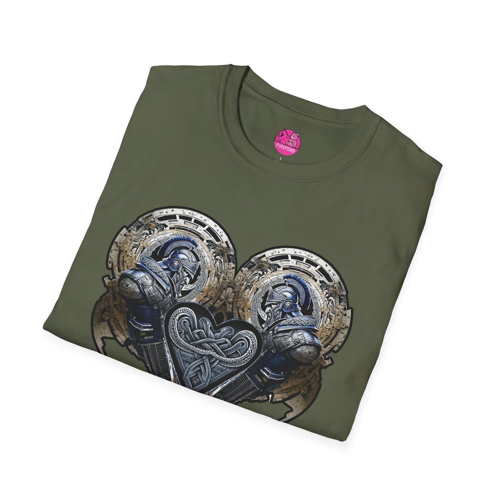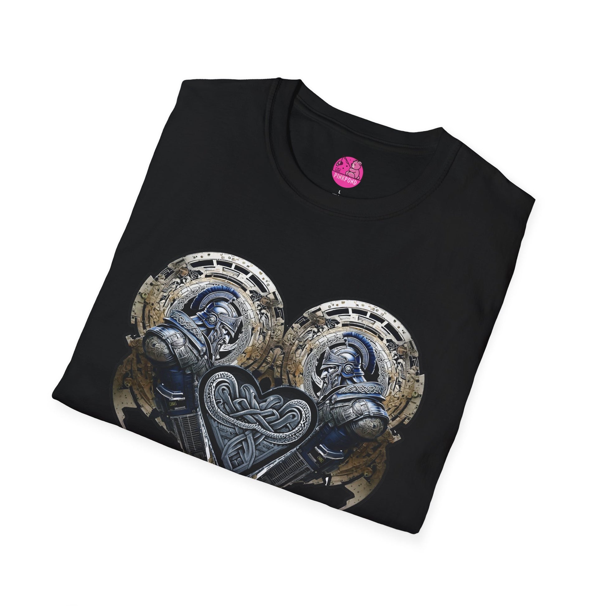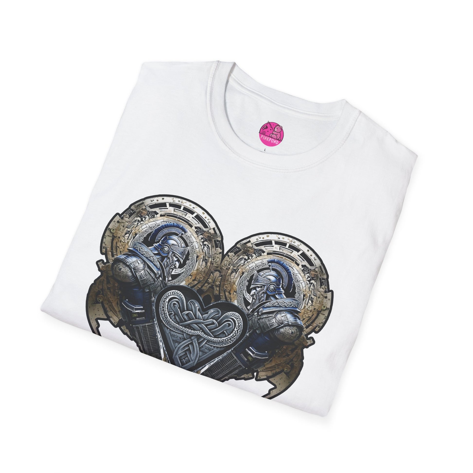 Step into a captivating fusion of ancient valor and futuristic flair with our Cybernetic Trojan – Twin Guardians of the Heart T-shirt. This eye-catching design showcases two formidable armored cyber-Trojan warriors, their sleek helmets and intricate battle gear embellished with bold Celtic and classical motifs. Positioned in perfect symmetry, they form a dynamic heart motif at the center, celebrating strength, unity, and resilience.