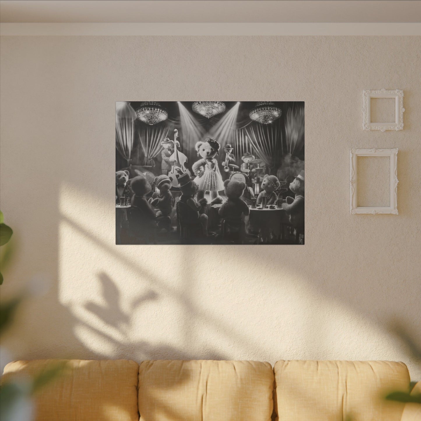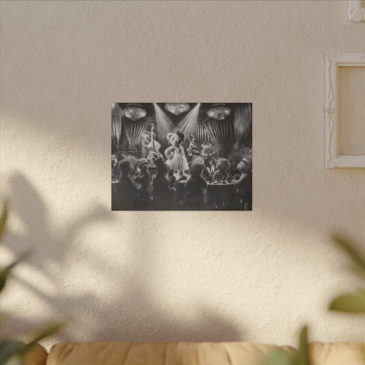 Step into a world of vintage glamour with Delilah and the Bear Bottom Band, a striking black-and-white artwork that blends nostalgia with whimsical charm. This meticulously crafted piece transports viewers to an intimate 1920s jazz club, where a soulful teddy bear chanteuse, Delilah, commands the stage, exuding confidence and star power.