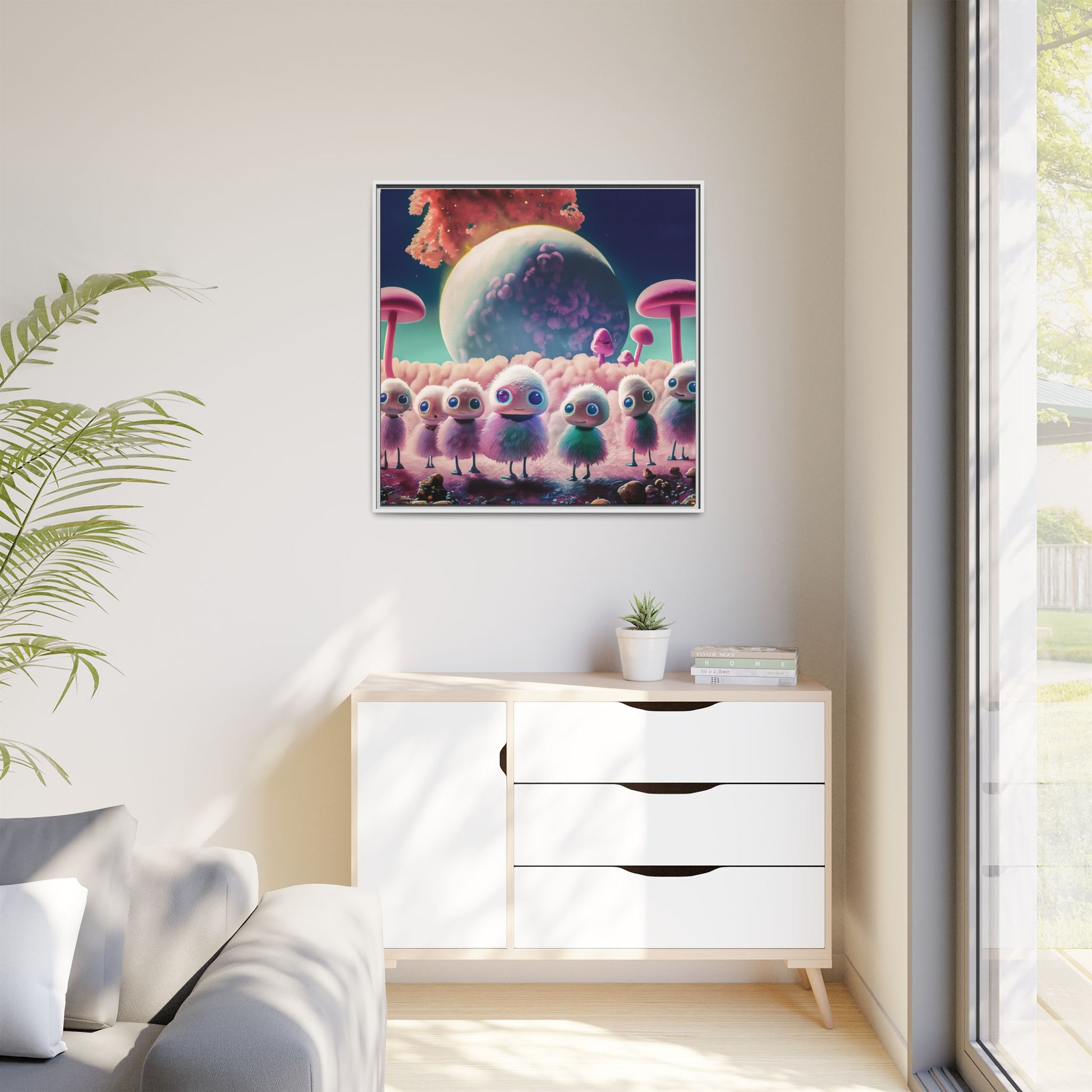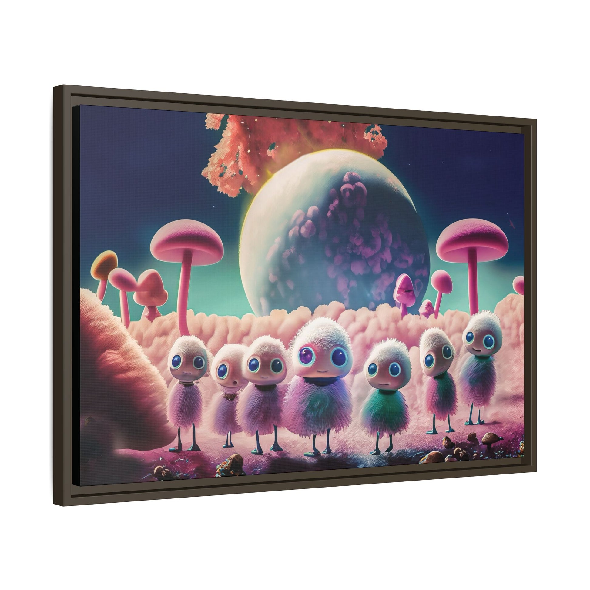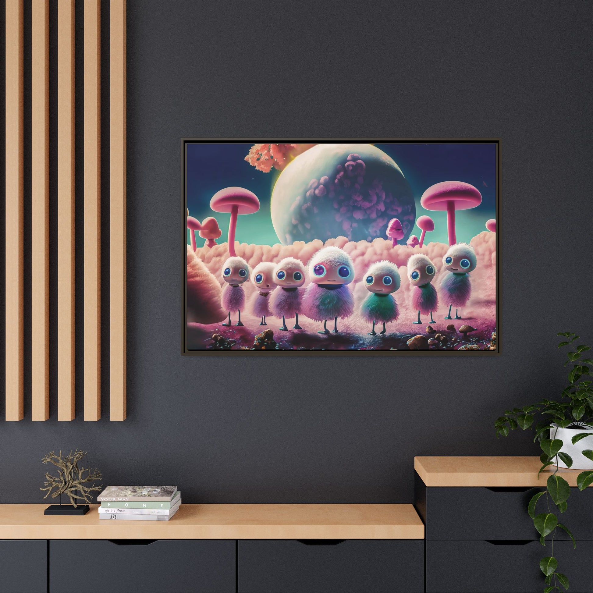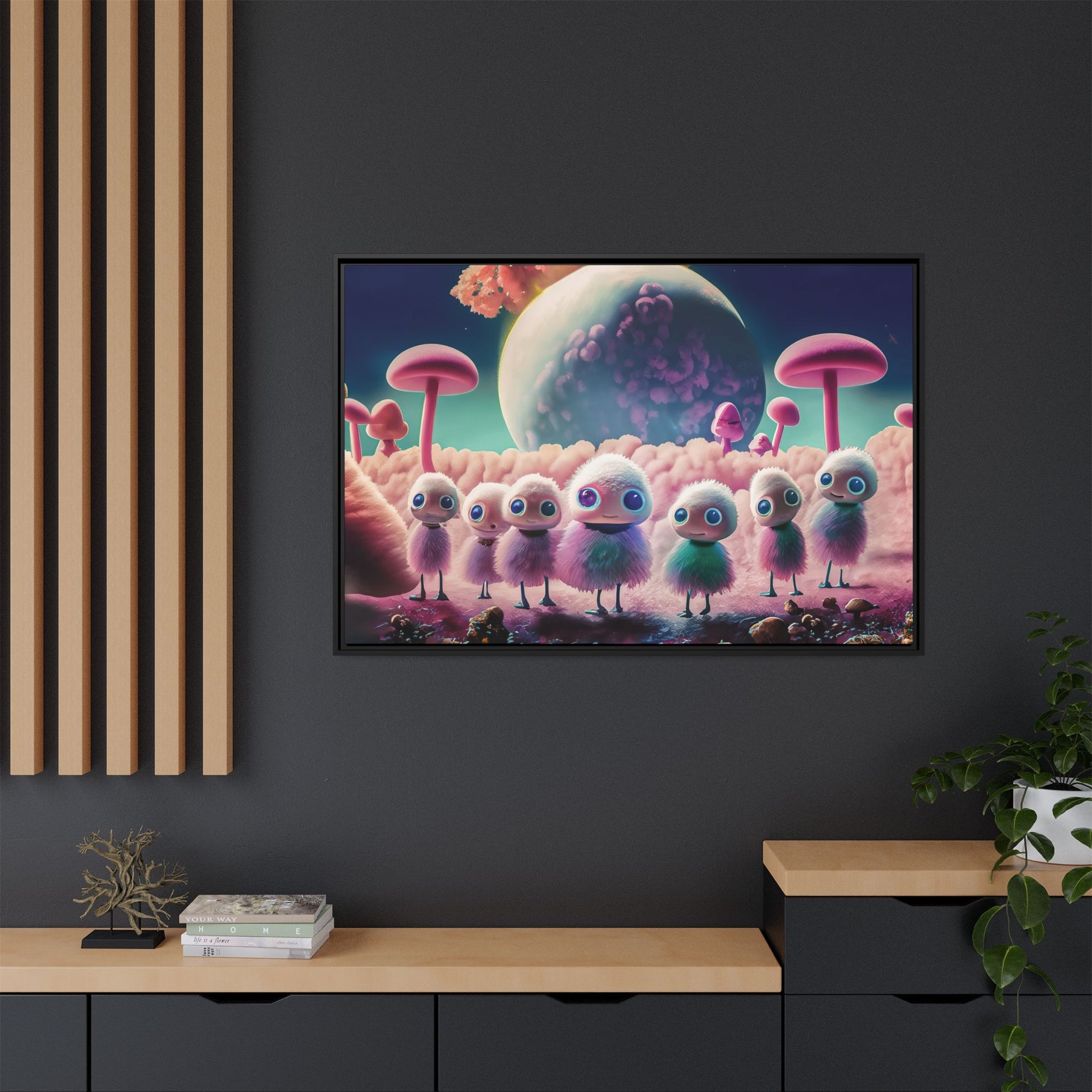 In a world bathed in a neon glow and dreamlike hues, a group of fluffy, wide-eyed creatures gathers under an alien sky—adorable, innocent, and perhaps just a little too friendly. However, beneath their endearing smiles lies an unsettling truth, perfectly captured in the ominous whisper of their leader, Axlar:“Keep smiling… we can eat them later.âThis captivating piece combines surreal fantasy with a darkly humorous twist, drawing you into a candy-colored dreamscape that balances between innocence and menace. The lush alien landscape, adorned with towering bioluminescent fungi and a distant cosmic horizon, creates a setting where the story unfolds in the imagination. Are these creatures simply misunderstood, or are they patiently waiting for their moment?