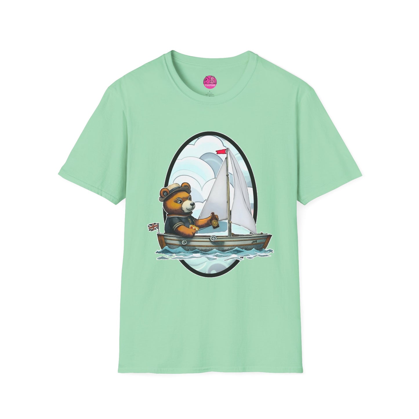 Sailing Bear Adventure Graphic T-Shirt - Nautical Fun with a Vintage Twist. Set sail in style with this charming T-shirt featuring a dapper bear in a vintage sailor outfit, enjoying a carefree day on the water. Perfect for lovers of maritime themes, playful nostalgia, and unique artwork. Great for casual wear, vacations, or gifting to sea lovers. Relevant for summer, beach vacations, sailing enthusiasts, and animal lovers.