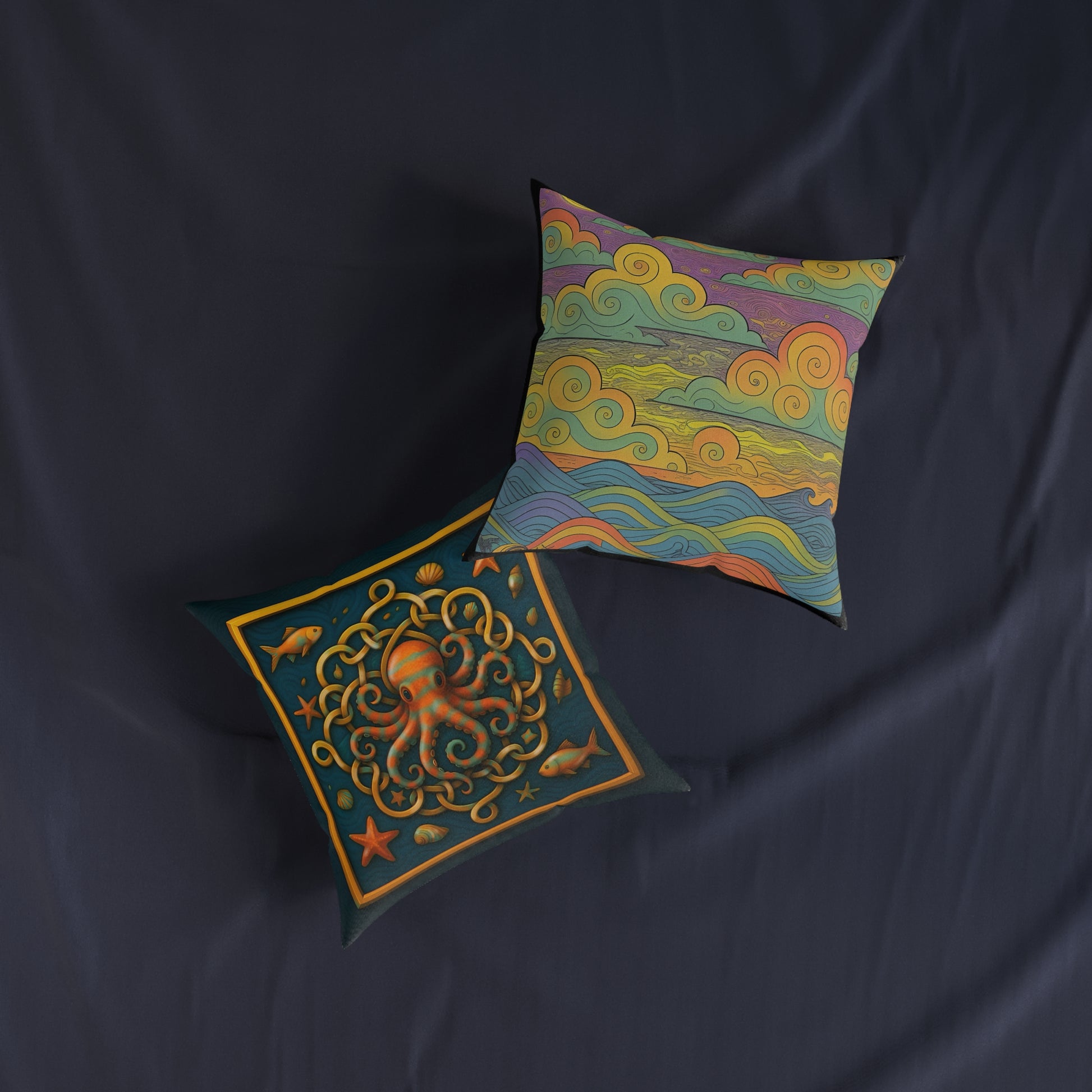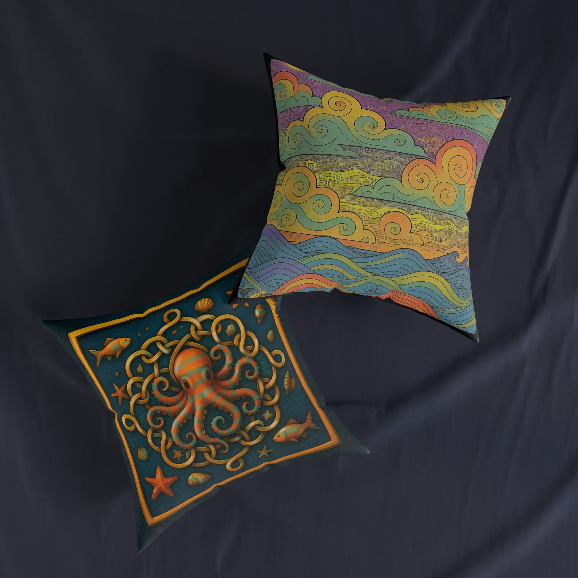 Square Pillow - Celtic Octopus Cushion with Teal Background and Golden Knots Design