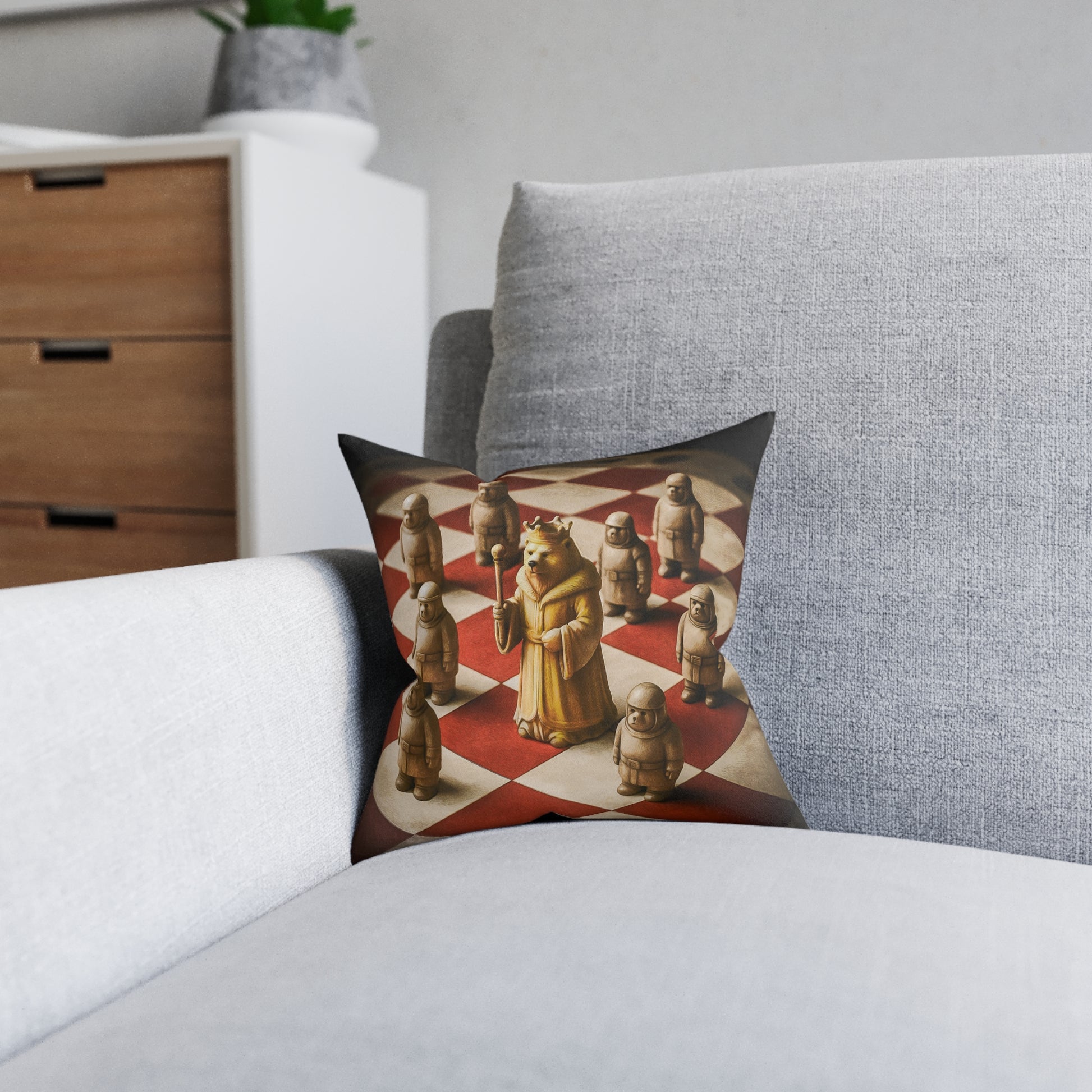 Bring regal charm and playful power to your living space with our Square Pillow – PinkPond King of the Bear Army Cushion. This reversible cushion offers two distinct looks: one side features our whimsical bear‑chess artwork, while the other presents a bold chessboard design. Crafted from soft, plush faux suede, this cushion adds comfort and character to your sofa, reading nook, or creative corner.